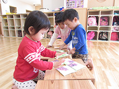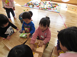 遊具教材の一部を手作りすることにより協力する喜びや表現する意欲を育てます。また、各年齢の発達を助ける遊具作りをしています。